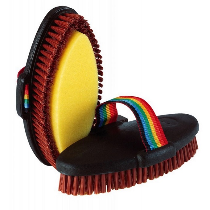 Двухцветная щётка на пластиковой основе с мягкой щетиной и поролоном. Мягкая щетина позволяет сделать шерсть лошади более блестящей, а благодаря поролону шампунь прекрасно пенится и экономно расходуется. Удобный ремешок для фиксации руки. Размер 15 х 5,5 см. Длина щетины 2,5 см