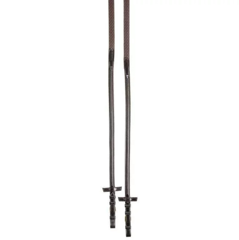 Мягкий резиновый повод на пряжкаx премиум качества. Мягкая резина поможет вам крепко держать поводья в руках даже во влажных погодных условиях. Они не будут проскальзывать в вашей руке как в жаркую погоду, так и когда шея вашей лошади вспотеет. Дополнительно кожаная часть повода усилена нейлоновой лентой. Фурнитура из нержавеющей стали.