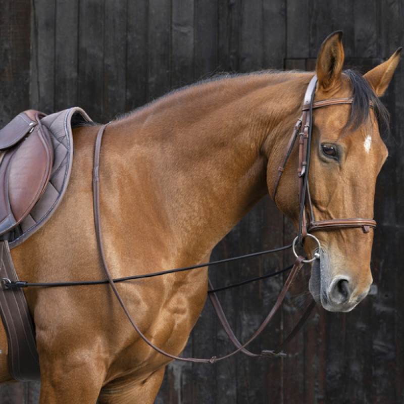 Эластичный шамбон для работы в руках или под седлом. Регулируется по длине на затылке с помощью зажима. С помощью карабинов крепится к кольцу на подпруге, проходит между передними ногами лошади и через кольца трензеля.